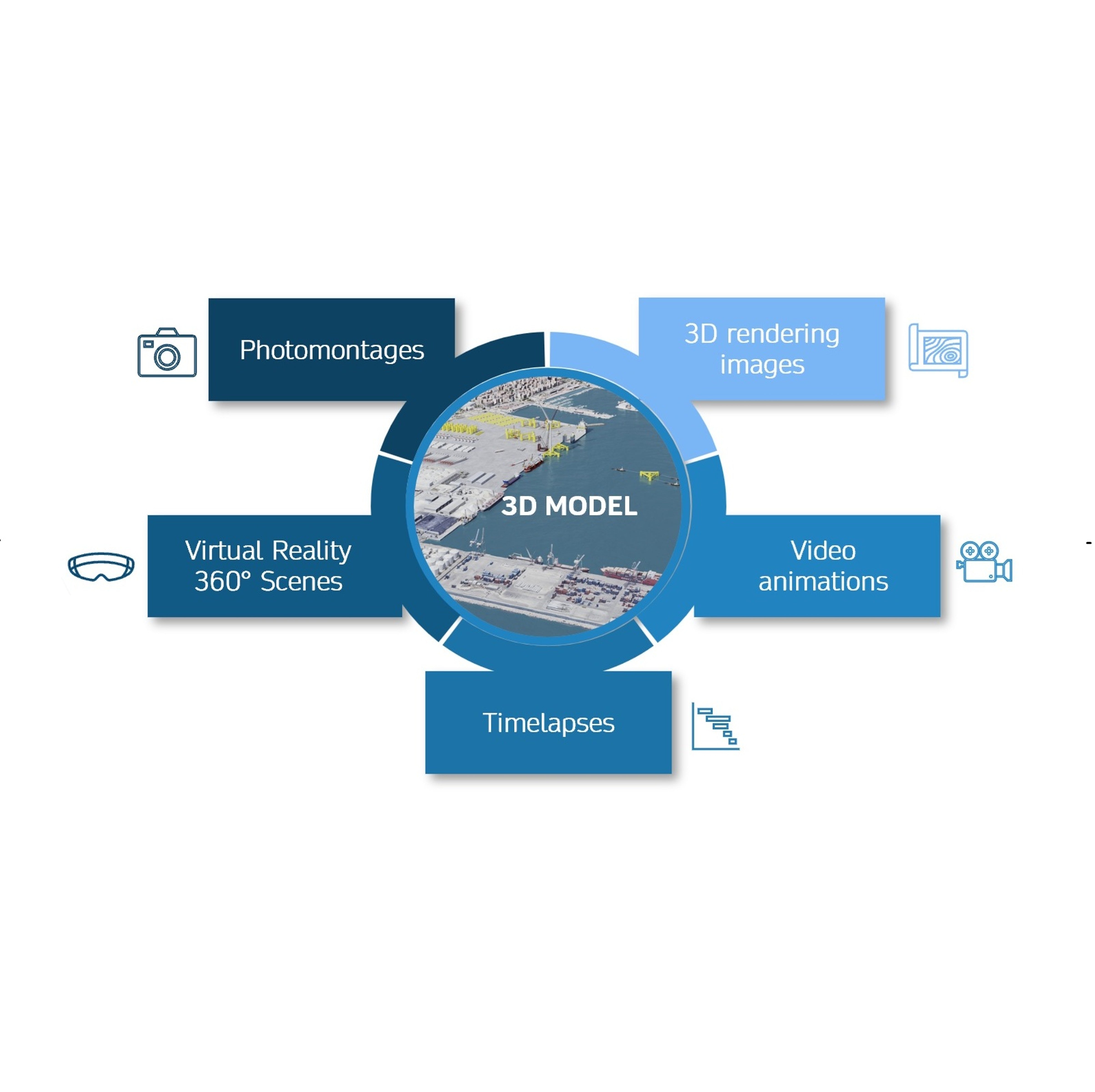 This approach is beneficial in terms of timing and budget, as the 3D model of the Port is shared to generate multiple outputs.